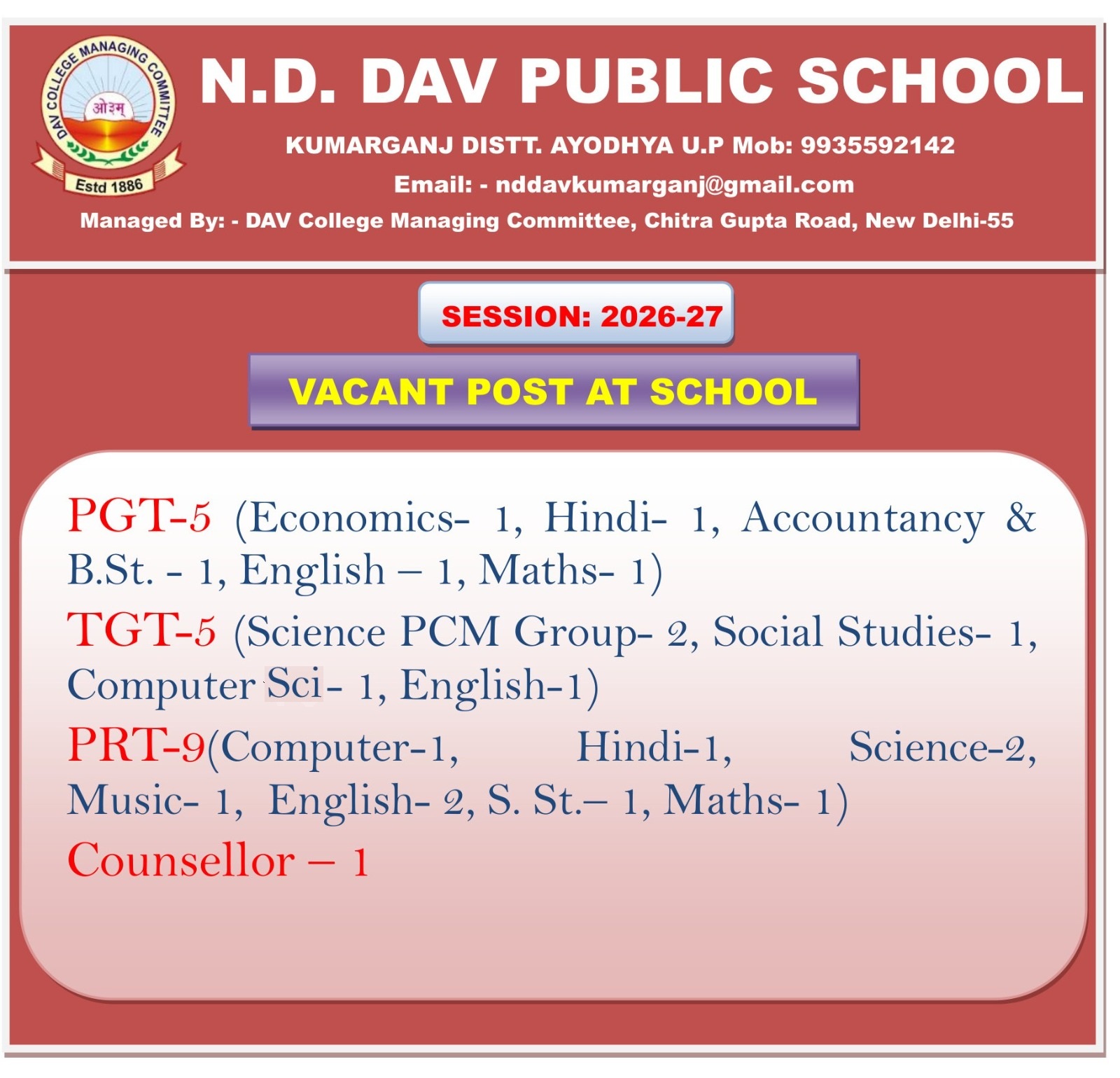DAV Kumarganj was establish in 1993 and since it has been training the flame of DAV we not only educate the students but prepare them for all aspects of life.DAV Kumarganj is situated in ND University of Agriculture & Technology Campus Kumarganj